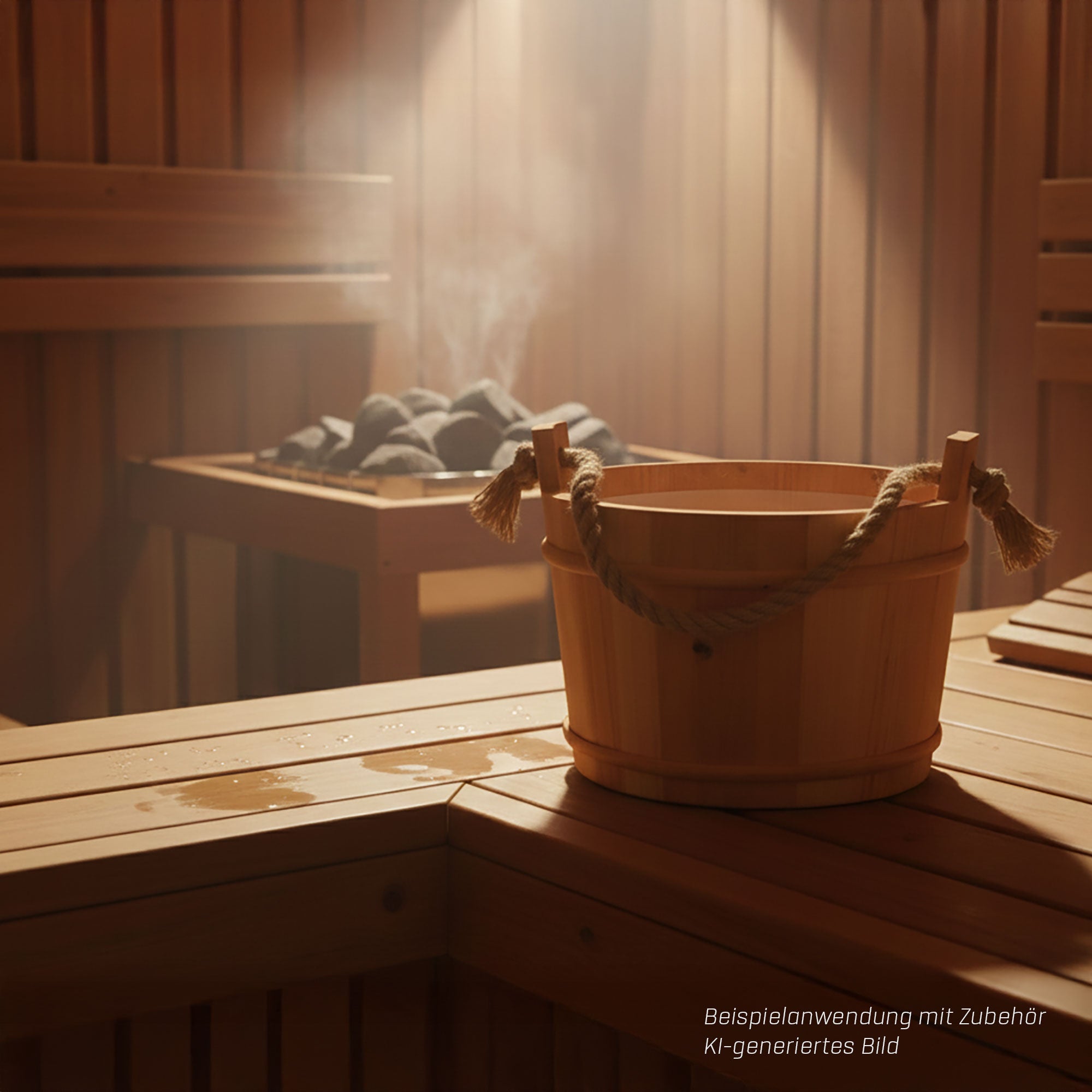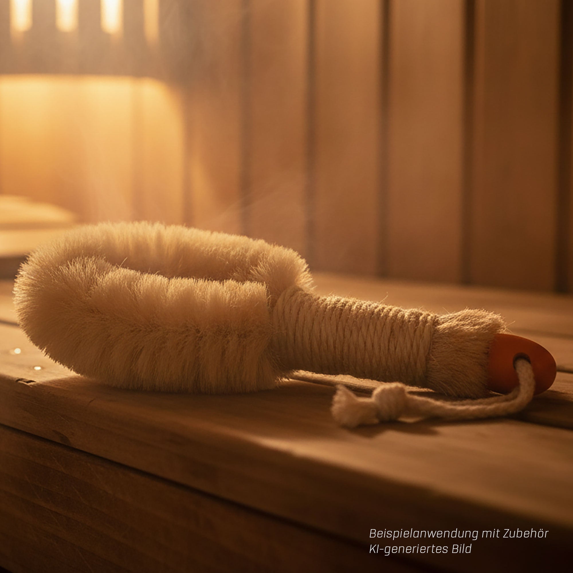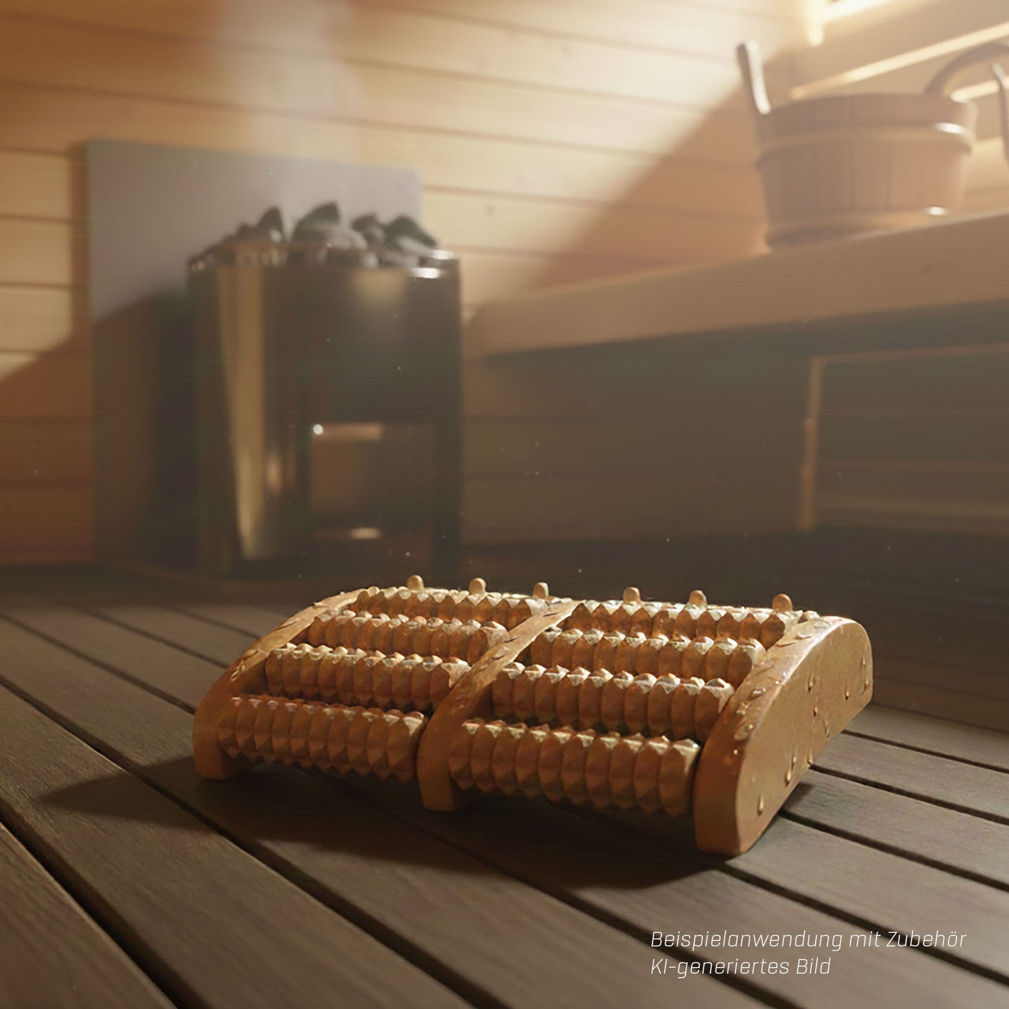 - Hochwertiges Zubehör: Aufgusseimer, Fußroller aus Lotusholz, Körperbürsten zur Hautpflege und Vitalisierung.