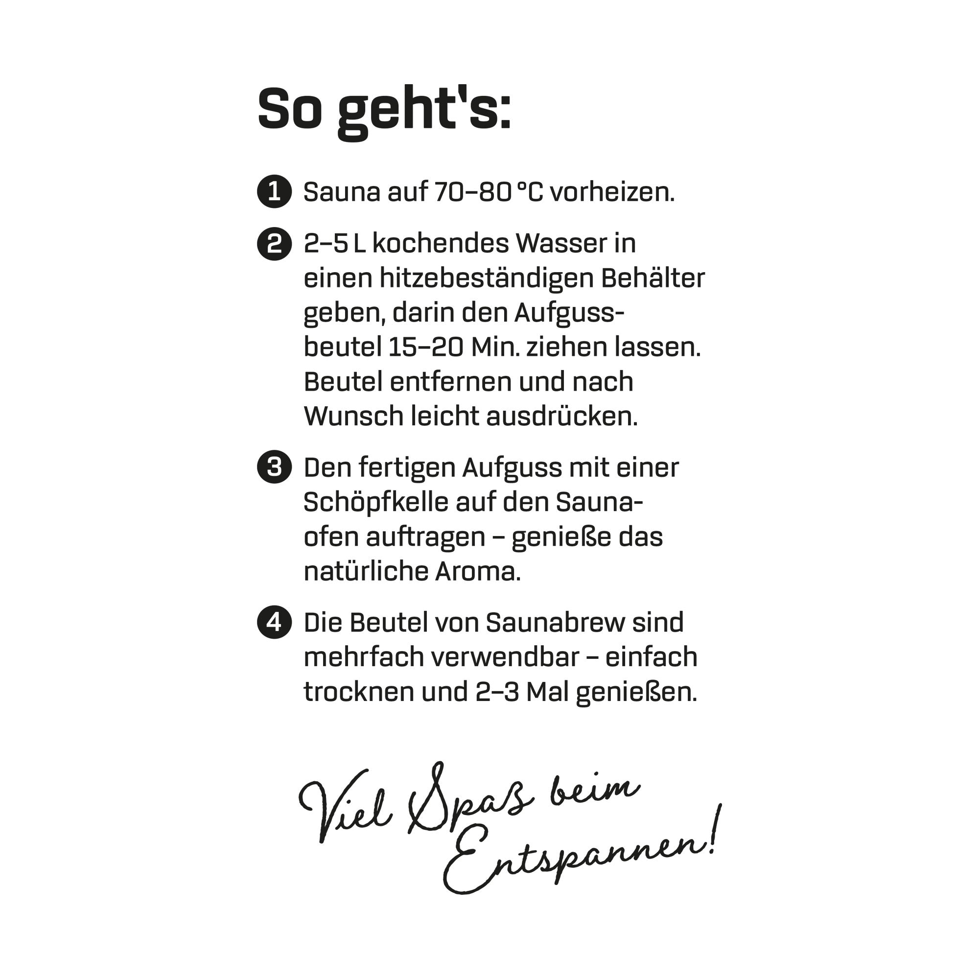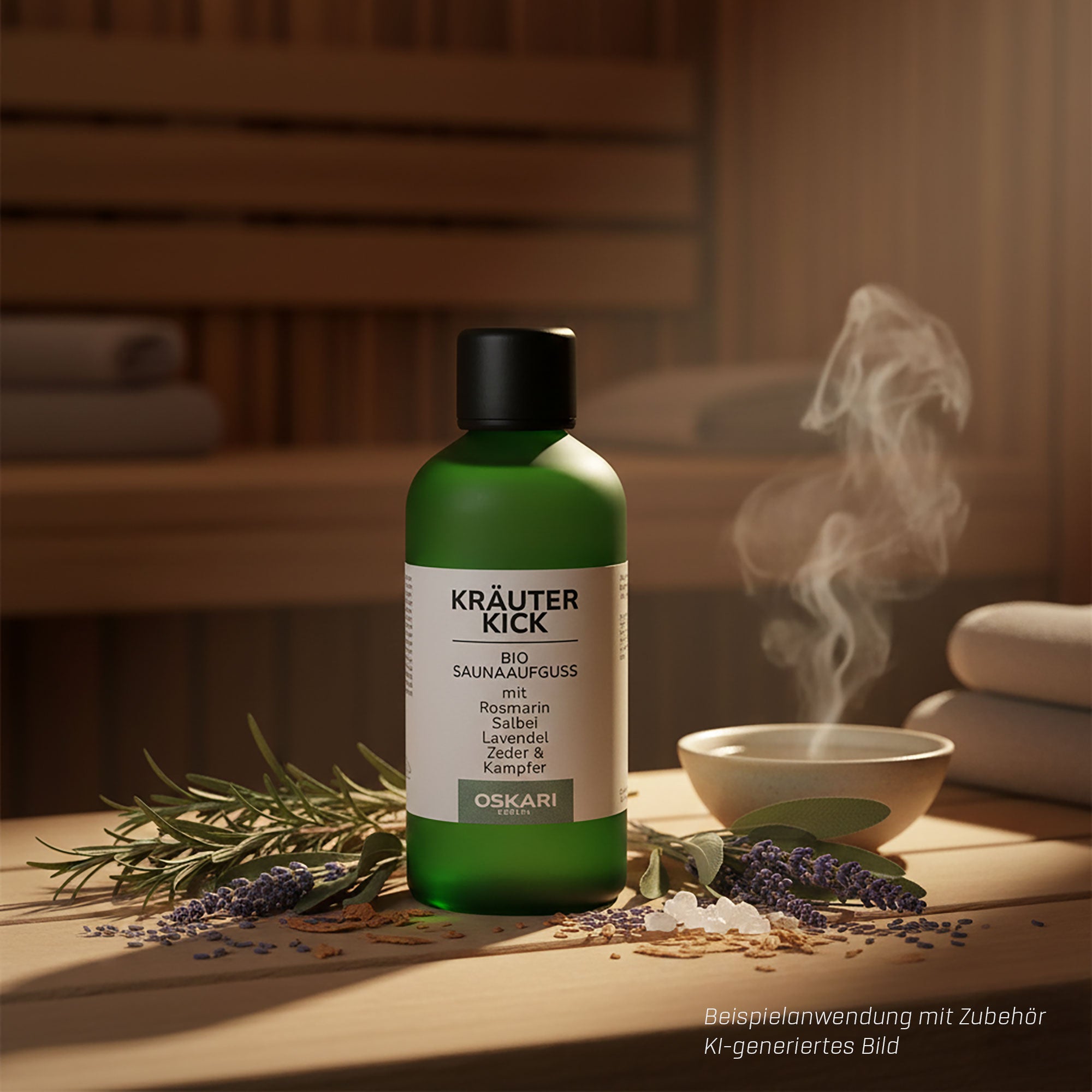 - Traditionelle Saunabrews: Naturkräuter wie Fichte, Eukalyptus, Salbei oder Lavendel für ein ganzheitliches Saunaerlebnis.