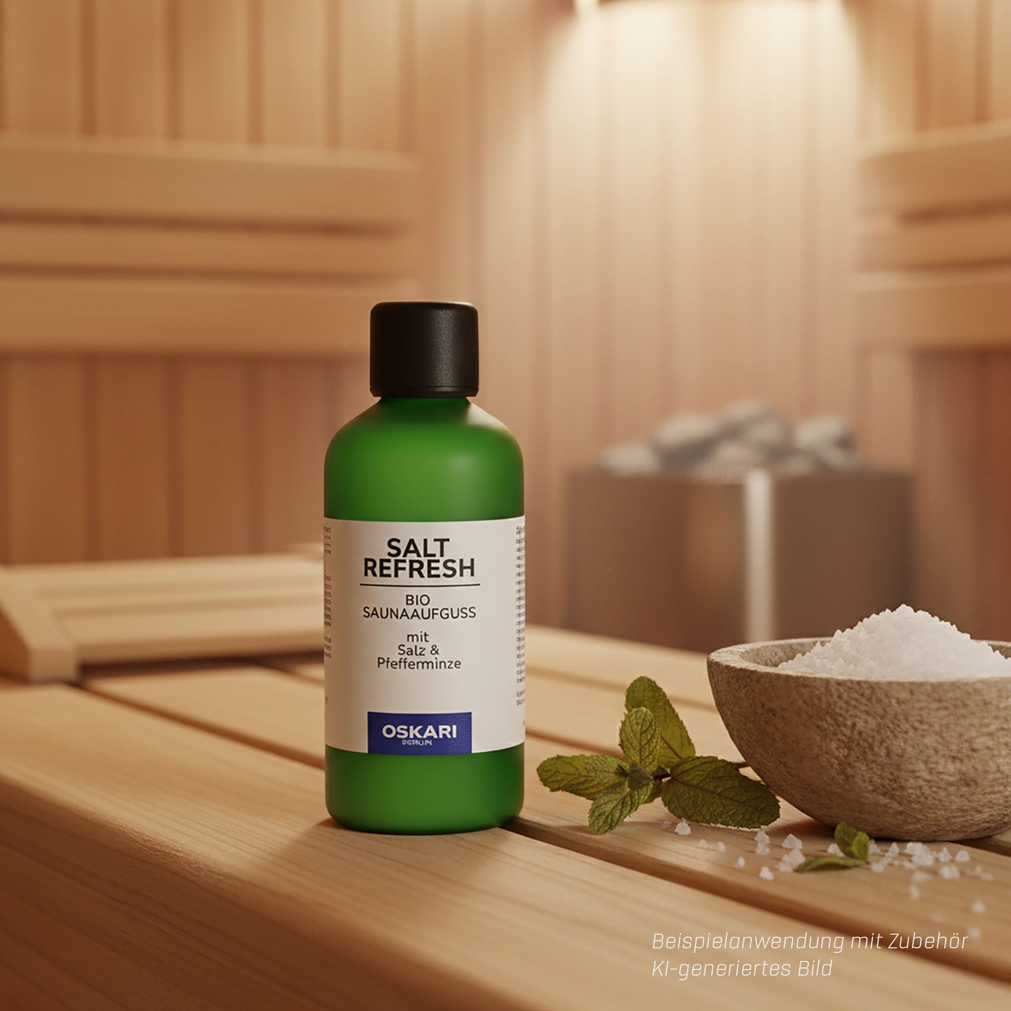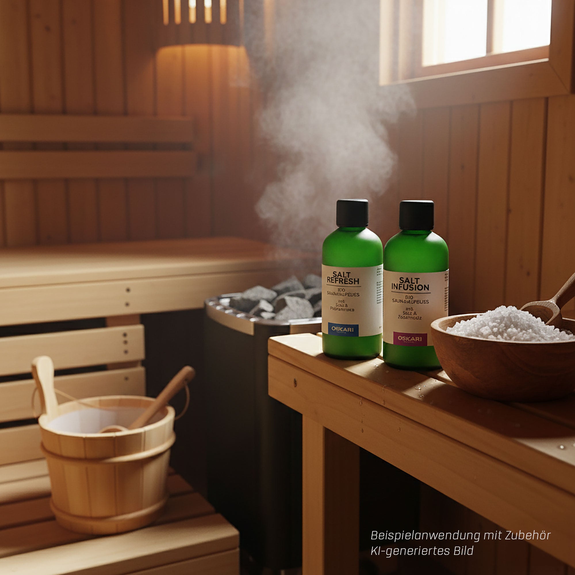 Bio Salz-Aufgüsse von Oskari vereinen intensive Saunawärme mit der reinigenden Kraft von Salz und naturreinen ätherischen Ölen und machen deinen Saunagang zum wohltuenden Spa-Ritual.